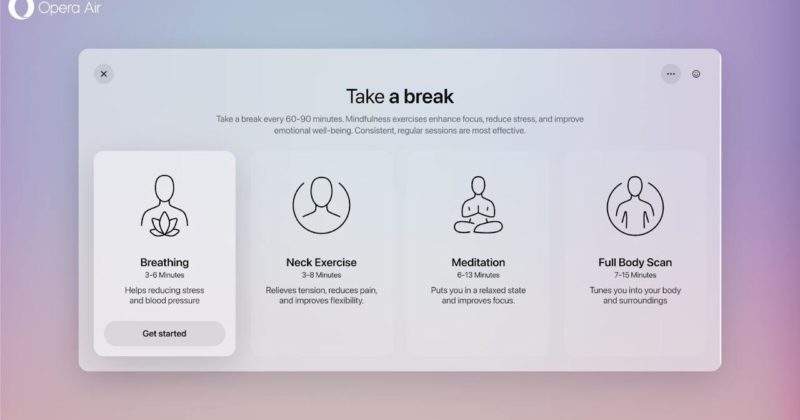 Здесь можно выбрать дыхательные упражнения, упражнения для разминки шеи, медитацию или «полное сканирование тела»
