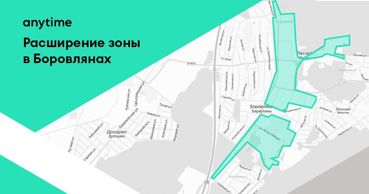 Минский Anytime продолжает расширять зону завершения аренды в Боровлянах. Сегодня оператор добавил новые локации, о чем сообщил в информационной рассылке: