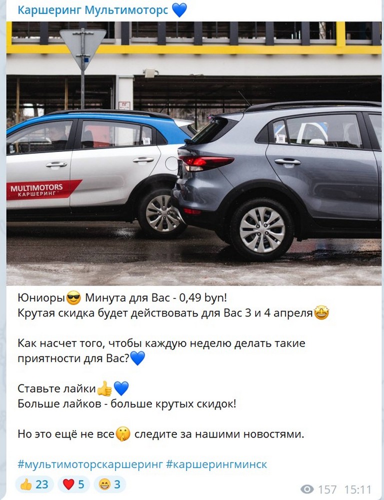 Белорусский каршеринг Multimotors делает скидку для тарифов Юниор. Минута поездки будет стоить 0,49 BYN (≈ 12.5 рублей).