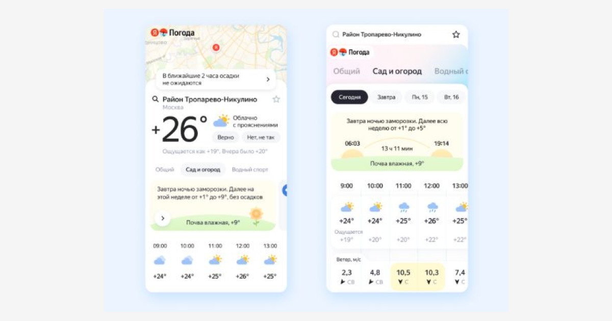 Первым подобный прогноз появился для садоводов. Для них добавили данные о влажности и температуре почвы, а также о возможных заморозках.