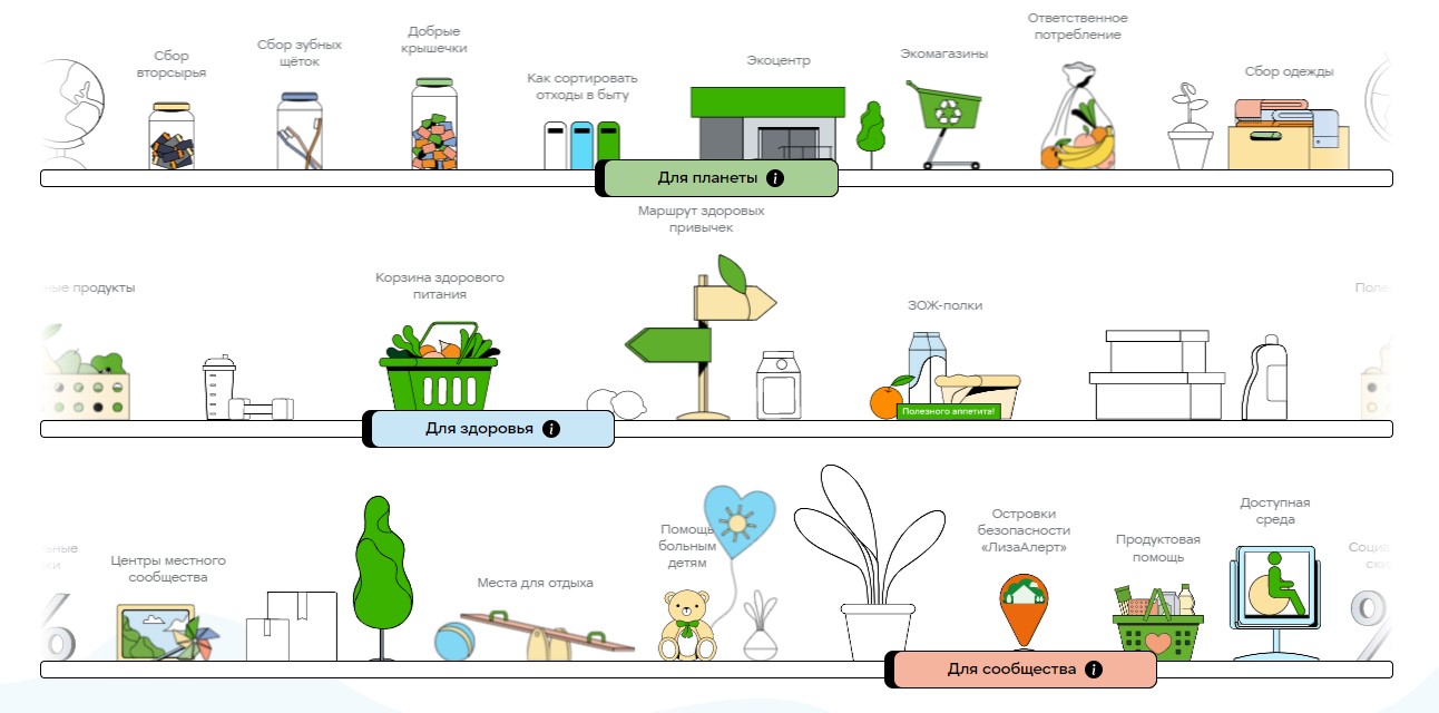 Для удобства на сайте размещена карта с магазинами, где можно сдать батарейки или пластиковые бутылки на переработку, купить бытовую химию на розлив через рефил-станцию, посетить магазины, оборудованные для слепых или маломобильных граждан, и другое.