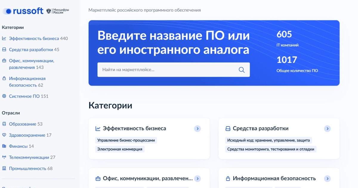 Продукты российского ПО теперь собраны на маркетплейсе Минцифры — Руссофт. По данным ведомства, сейчас на сайте размещено более 1000 продуктов от 600 ИТ компаний.
