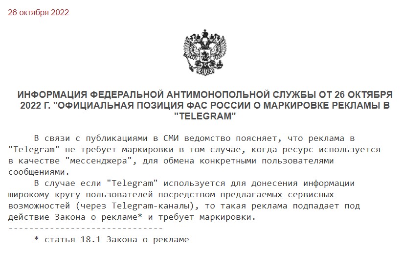 Апдейт: ФАС разъяснила, что маркировать рекламу все таки обязательно, если она размещена в Telegram-каналах. Если Telegram используется как мессенджер для обмена сообщениями между пользователями, то маркировать рекламу не нужно.