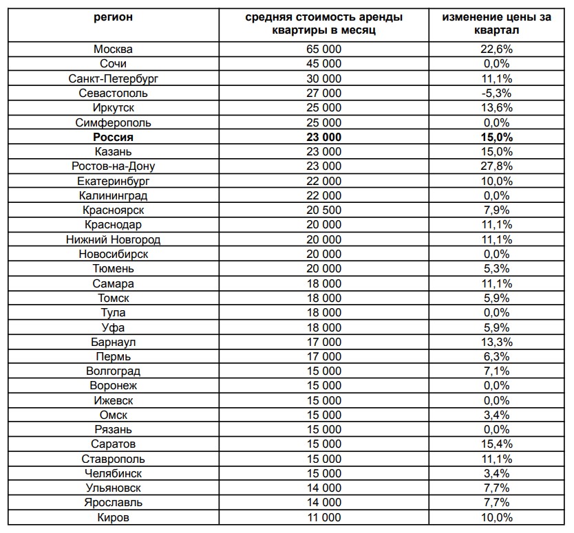 За квартал цены на аренду квартир в России выросли на 15%. В среднем по России месячная аренда стоит 23 тысячи рублей. «Однушка» обойдется в 19 тысяч, студия — в 20 тысяч, «двушка» — в 25 тысяч рублей. За «трешку» нужно заплатить 40 тысяч рублей.
