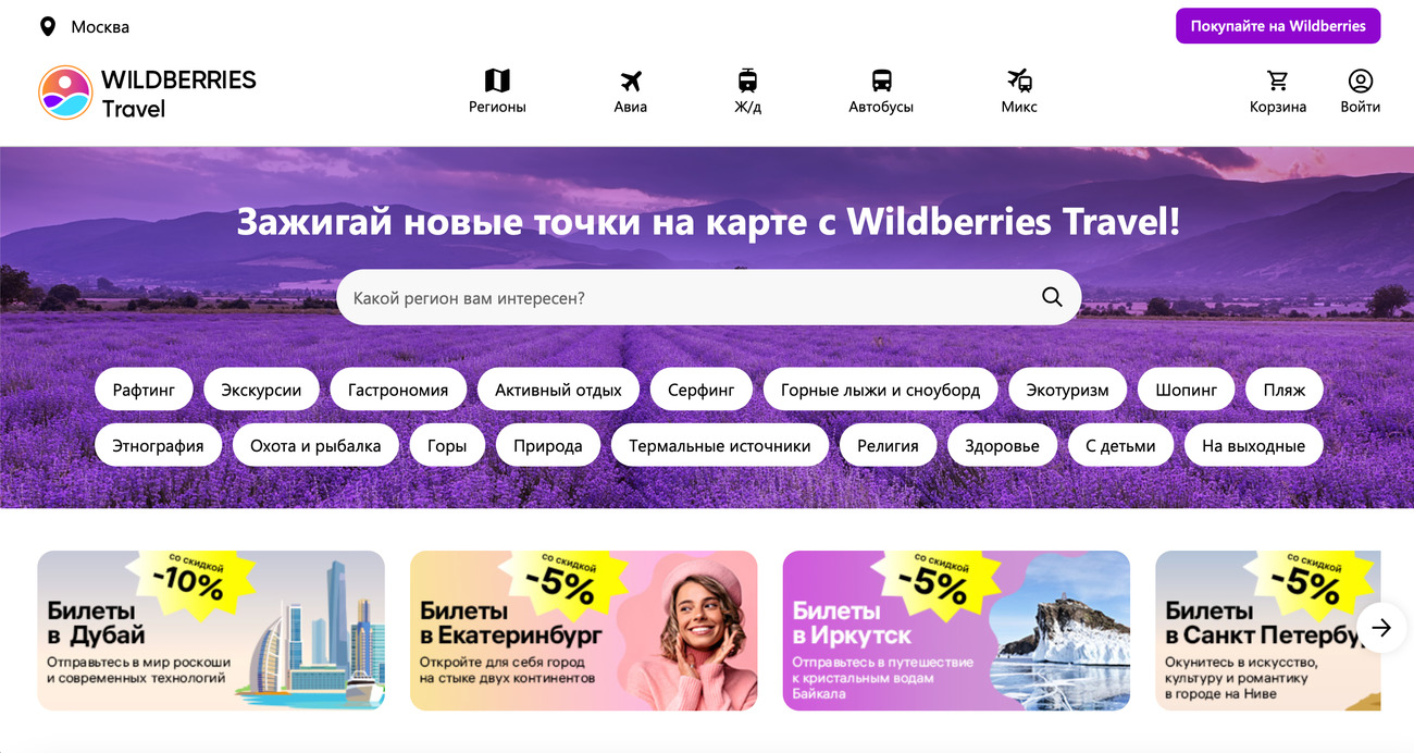 Маркетплейс Wildberries запустил сервис путешествий Wildberries.Вместе. Там можно забронировать билеты на самолет, поезд и автобус или построить сложный маршрут с разными видами транспорта. Кроме того, на сайте есть статьи и новости о путешествиях, идеи для отдыха и раздел с товарами, которые могут понадобиться туристу.