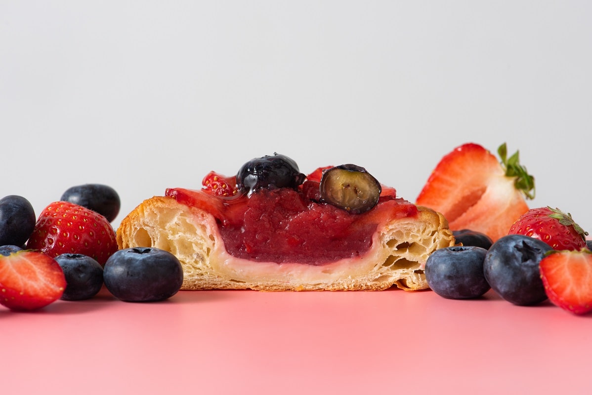 Круассан со сливочным кремом и джемом тоже выпекают из слоёного теста. А сверху его украшают воздушным кремом из натуральных сливок, свежей клубникой и голубикой. Последние два вида ягод, по данным Самоката выращивали в защищённом грунте на современном агрокомплексе компании Артфрут. А манго созревало в специальных камерах.