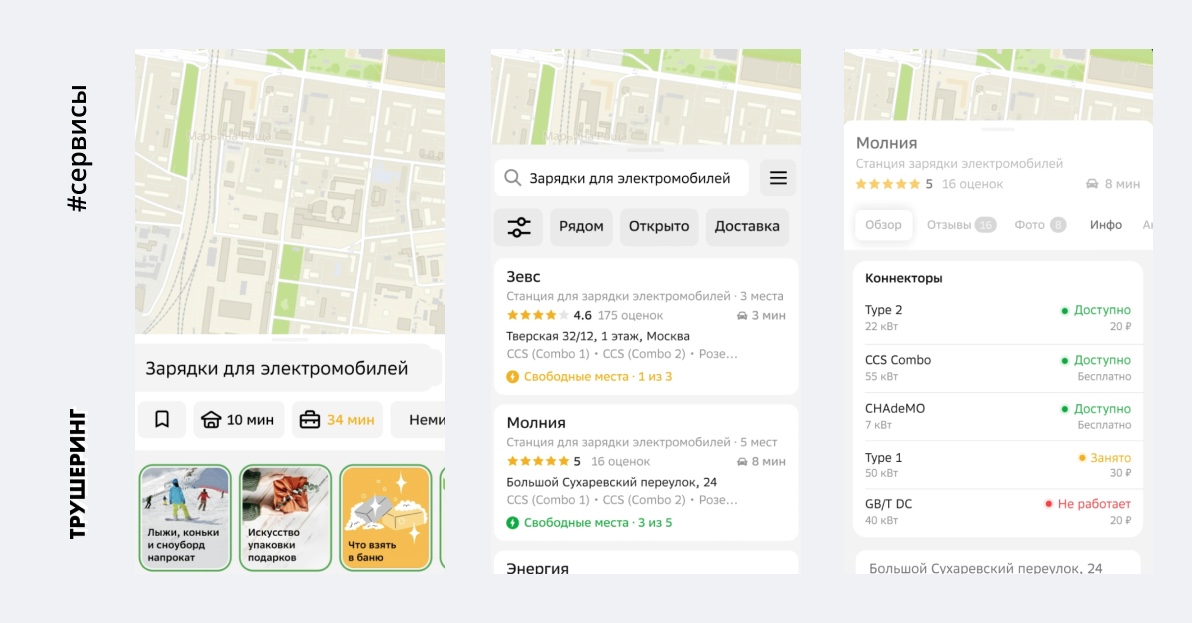 Водители смогут увидеть свободные станции, чтобы в случае необходимости построить маршрут к наиболее близкой. Функция доступна при выборе электрозаправки – для этого пользователям необходимо найти её в поиске. Зелёной точкой будут отображены станции, у которых доступны все или большинство коннекторов.
