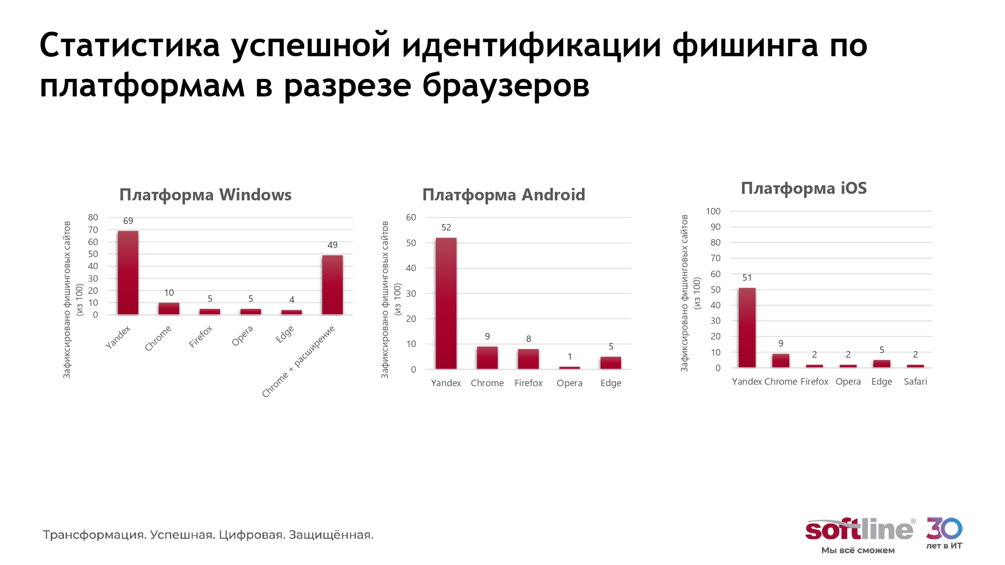 В ходе проверки группы компаний Softline Яндекс Браузер в десктопной версии на Windows смог выявить 69 из 100 угроз, связанных с фишингом. Мобильная версия обнаружила 51 и 52 угрозы на Android и iOS соответственно. Средняя оценка для всех платформ составила 57 из 100.