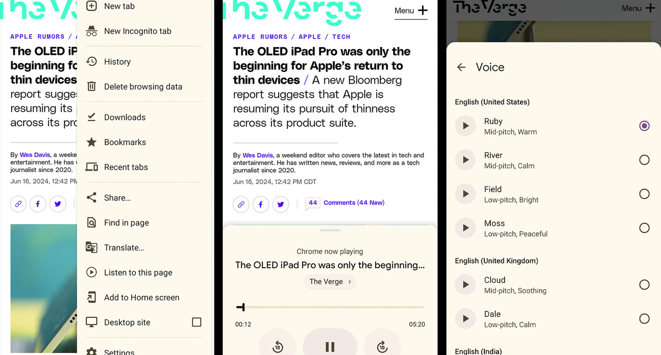 Google постепенно внедряет опцию «Слушать эту страницу», которая воспроизводит большие тексты вслух. Пользователи смогут менять голос и язык озвучки. В настоящий момент доступны английский, французский, немецкий, арабский и испанский языки, а также хинди. Чтобы включить функцию, необходимо зайти на нужную веб-страницу, нажать на три точки в меню и выбрать пункт «Слушать эту страницу» – он расположен ниже иконки с переводом.