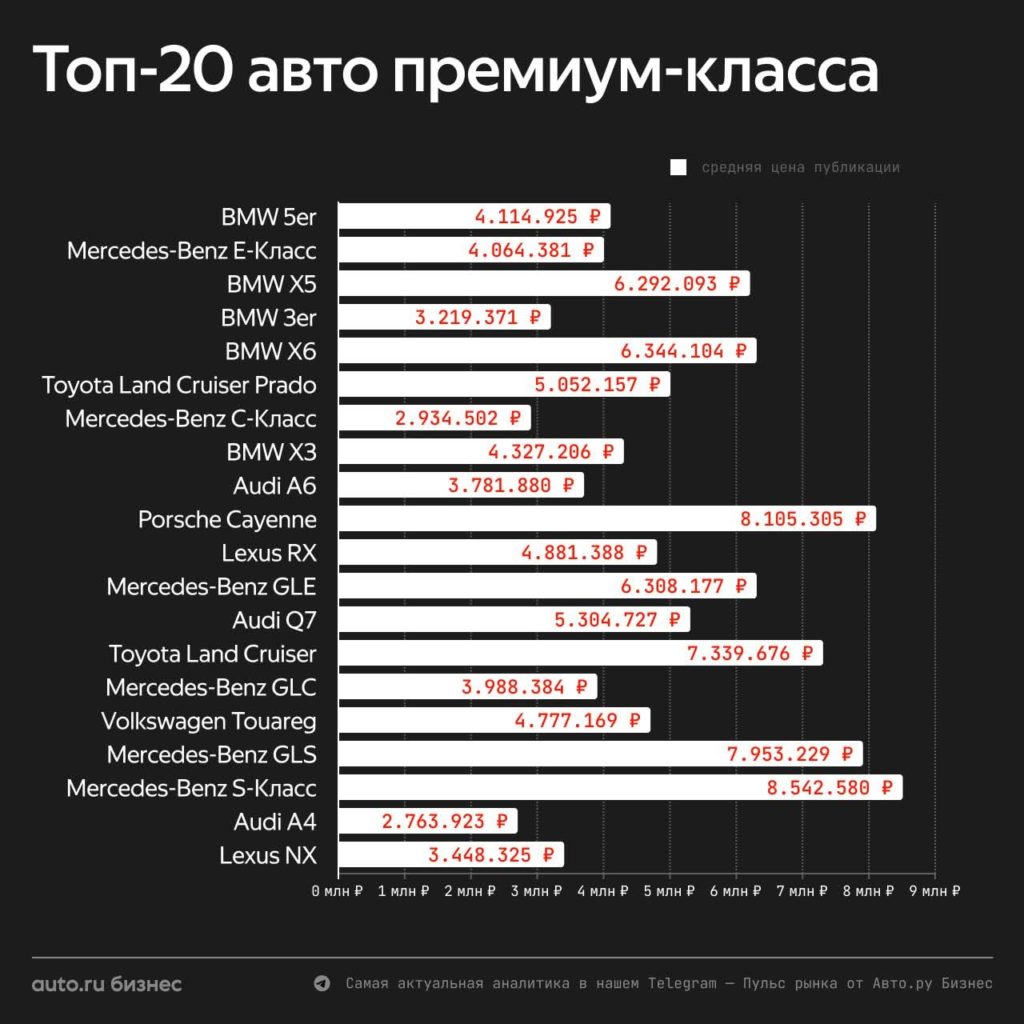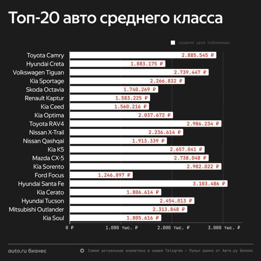 В сегменте эконом-класса лидером по продажам стала Kia Rio, за ней следует Lada Granta и Lada Vesta. В среднем классе на первом месте оказалась Toyota Camry, за ней идут Hyundai Creta и Volkswagen Tiguan. В премиальном сегменте доминируют немецкие бренды. Открывает тройку лидеров BMW 5er, второе место занимает Mercedes-Benz E–Класс, третье — BMW X5.
