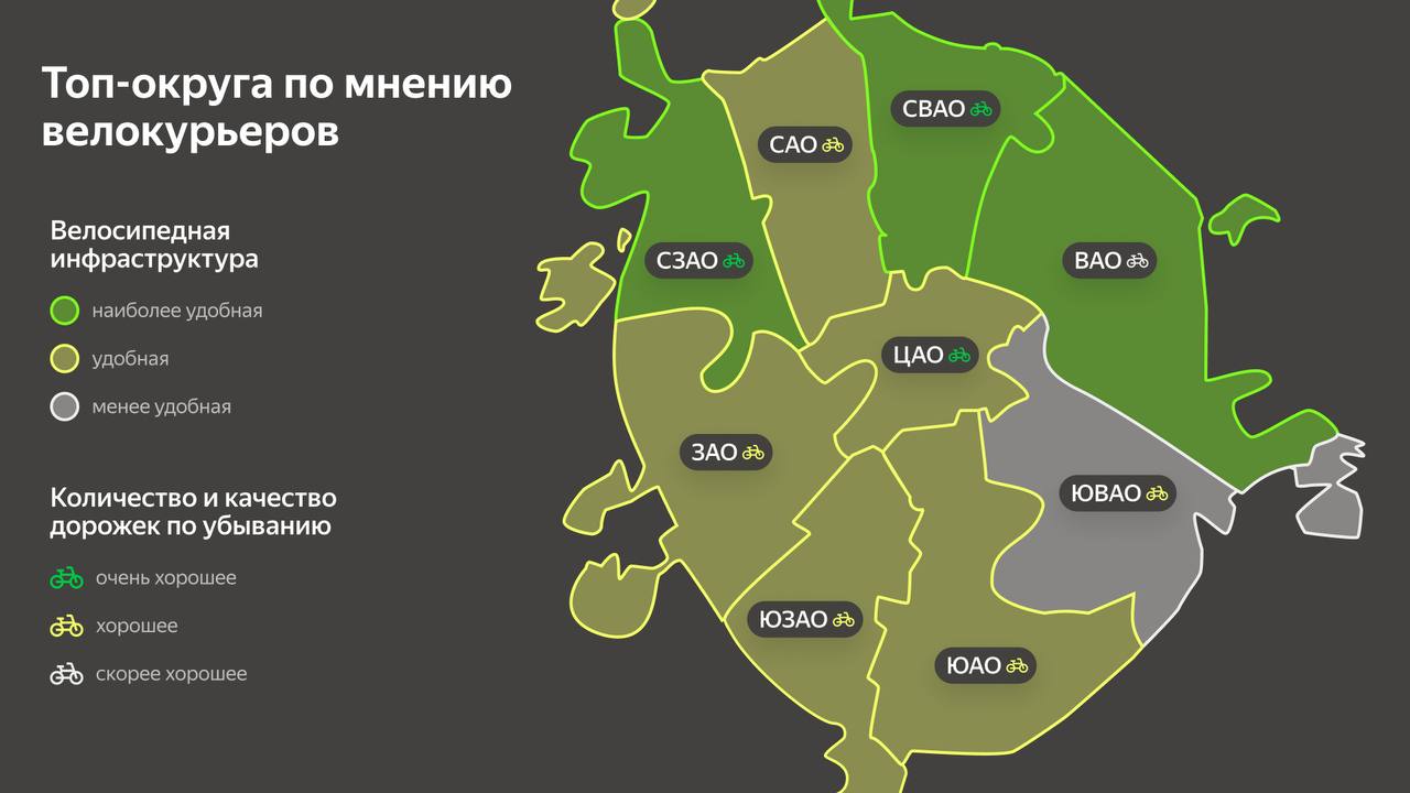 В целом курьеры положительно оценивают велоинфраструктуру Москвы. Наиболее удобными для перемещения округами стали СЗАО, СВАО и ВАО. По количеству и качеству велодорожек лидируют СЗАО и ЦАО.