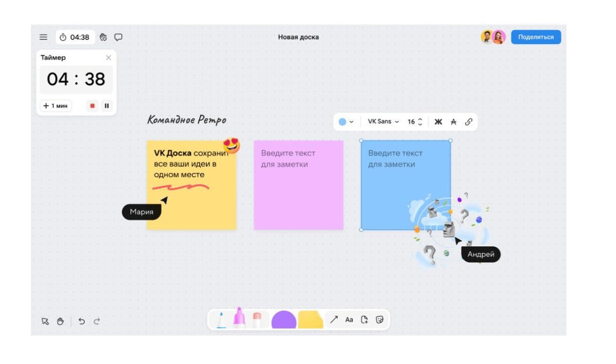 VK сообщила о тестировании собственного сервиса создания умных досок. Пользователи смогут вставлять текст, изображения, фигуры, стикеры и другие элементы. Сервис имеет внутренний таймер, позволяющий отслеживать рабочее время. VK Доска также поддерживает совместную работу.