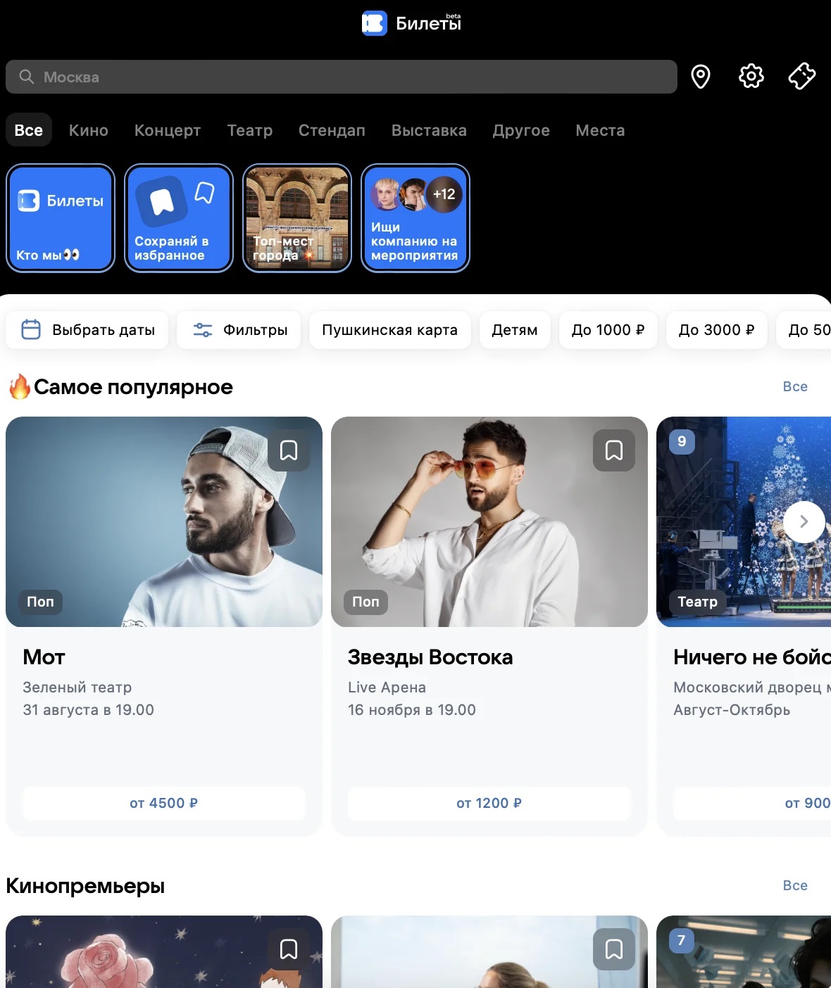 На главной странице Билетов есть выбор по категориям заведений, а также удобные фильтры, которые позволят найти подходящий досуг, среди них: «Детям», «До 1000 рублей» и другие. Из других фишек можно отметить систему отзывов и опцию «Найти компанию» для знакомства.