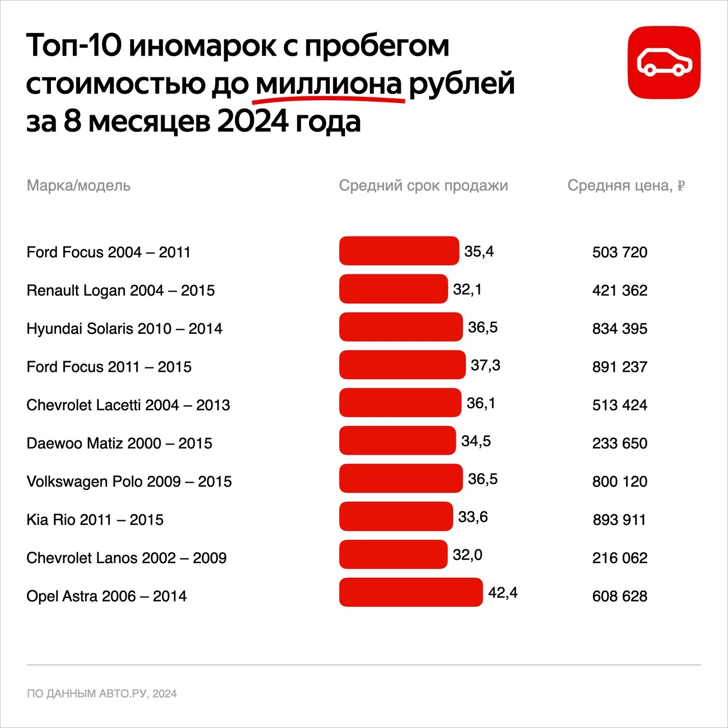 Замыкает тройку лидеров Hyundai Solaris от 2010 до 2014 года выпуска. За ним идут Ford Focus от 2011 до 2015 года и Chevrolet Laccetti от 2004 до 2013 года. Самой дорогой в первой пятёрке оказалась продукция Ford Focus от 2011 года, а доступной — Renault Logan от 2004 года.