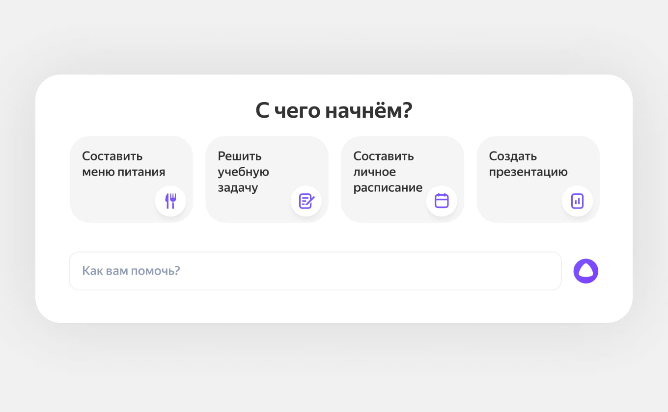 Чтобы воспользоваться функционалом Про при первом посещении сайта, пользователям будет показан пустой чат с подборкой категорий для запросов. Например: «Получить советы по ЗОЖ», «Узнать рецепты блюд», «Решить учебную задачу» и другие.
