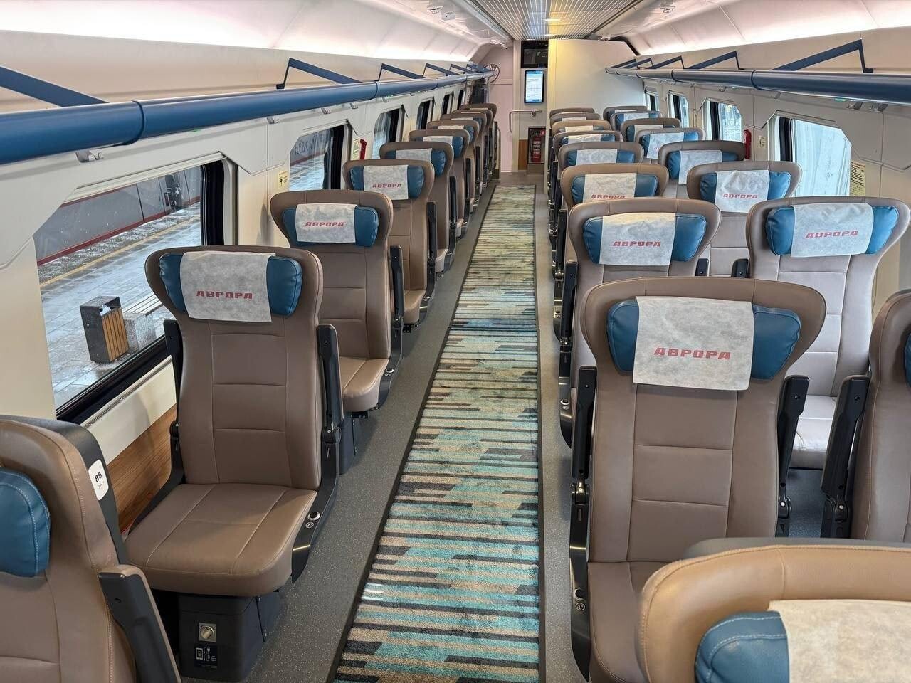 В составе двухэтажной Авроры есть сидячие вагоны как стандартной, так и улучшенной компоновки. В последних кресла разворачиваются на 180 градусов. Также есть вагон СВ, купе и вагон-бистро. Все кресла оснащены подножками и откидными столиками и оборудованы индивидуальными розетками и USB-разъёмами.