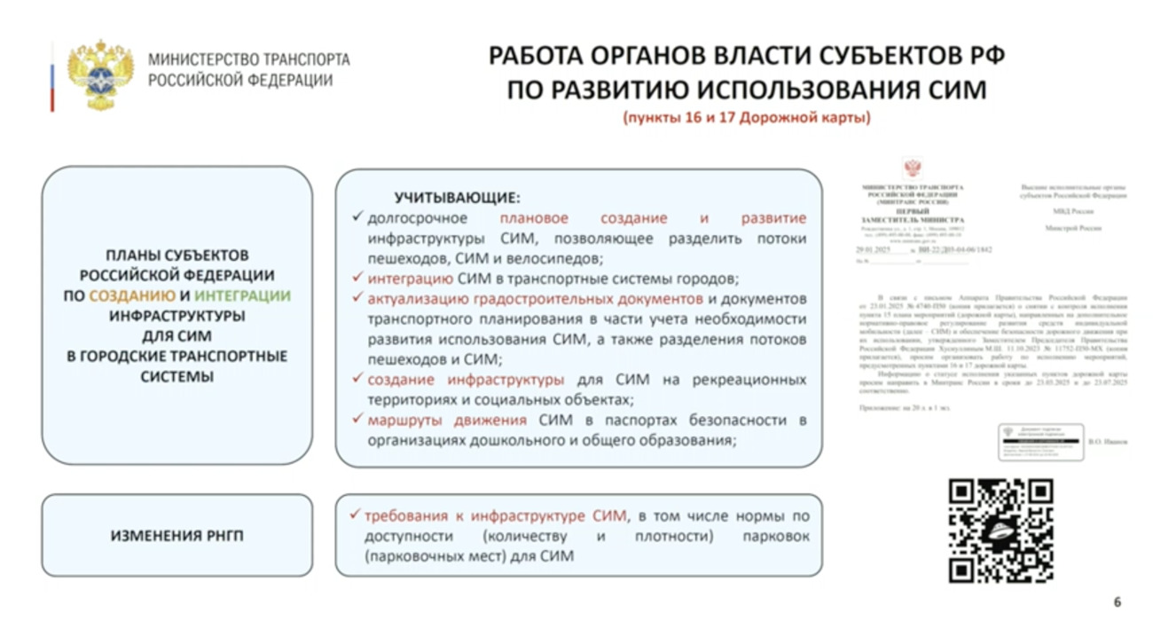 В 2025 году город планирует также упорядочить самокаты на улицах. Мы запросили у операторов места, где бы они сами хотели размещать СИМ, где их ставить можно и нельзя. На данный момент согласовали 30 парковочных мест. На нашем примере мы показываем другим городам, что СИМ — такой же общественный транспорт».