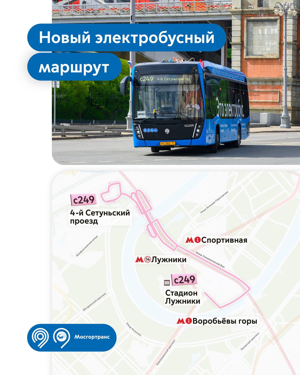Маршрут с249 заработал в трёх районах ЦАО и ЗАО. Электробусы будут проходить через МЦК Лужники и станции метро Спортивная и Воробьёвы горы. По словам Дептранса Москвы, это позволит быстрее добираться до крупных спортивных объектов. По будням новый маршрут будут обслуживать два электробуса.