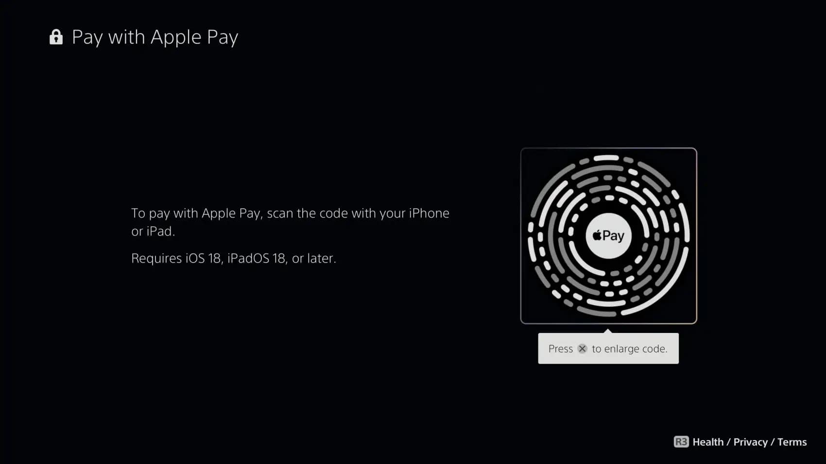 Теперь на PlayStation 5 при оплате корзины сервис предлагает использовать платежи от Apple. На экране появляется QR-код, который нужно отсканировать через iPhone или iPad. После этого достаточно пройти аутентификацию Face ID или Touch ID, чтобы совершить покупку.