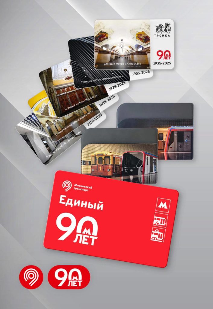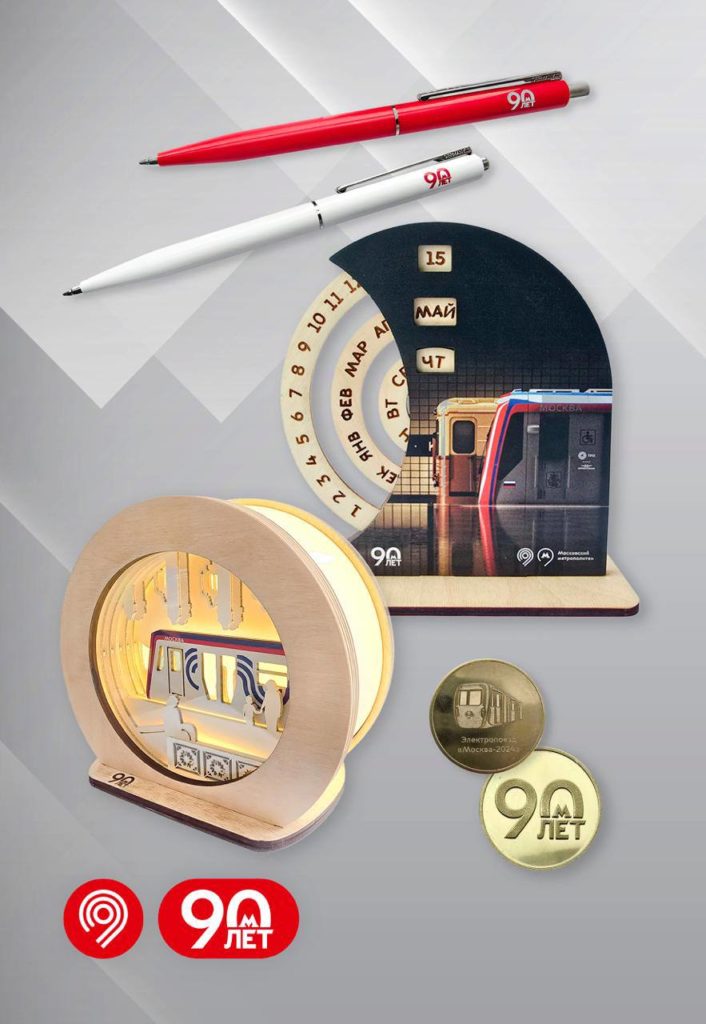 Жители и гости столицы могут приобрести карты Тройка с интерьерами станций, например, Комсомольской, Киевской, Курской и Воронцовской. Также для них подготовили тематические проездные Единый и различные сувениры, среди которых держатели для карт, светильник, жетоны, открытки и брендированные ручки. На всех товарах изображён логотип 90-летия метро.