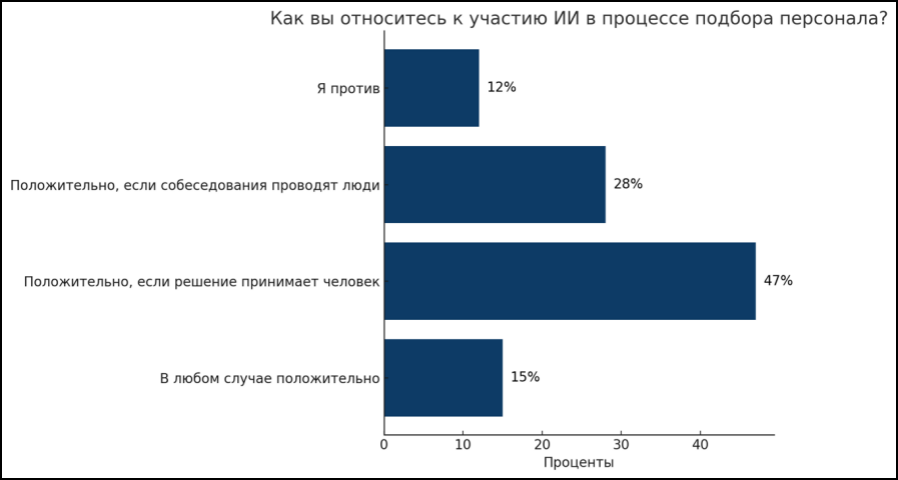 Ключевым преимуществом ИИ соискатели считают его объективность: 87% верят, что алгоритмы могут быть непредвзятыми, особенно при правильной настройке и сочетании с человеческим контролем. Почти половина опрошенных (46%) отмечает, что ИИ меньше подвержен стереотипам и эмоциям, чем люди. Примерно столько же (45%) ценят, что при использовании ИИ все кандидаты оцениваются по одинаковым критериям, поэтому шанс столкнуться с субъективным отношением минимален.