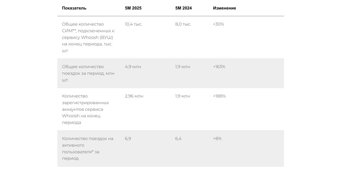 Кикшеринг Whoosh объявил операционные показатели в Южной Америке за пять месяцев 2025 года, по окончании активного сезона. Количество поездок в странах Южной Америки за этот период составило около 4,9 млн и выросло на 163% по сравнению с пятью месяцами 2024 года.