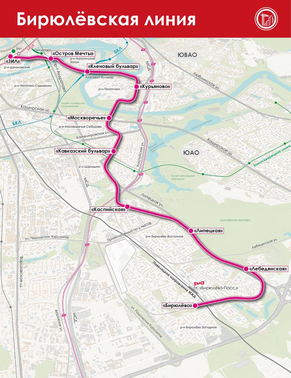 Саму Бирюлёвскую линию будут запускать поэтапно. Сперва будет открыт участок ЗИЛ — Курьяново. В его состав войдут четыре станции, а пассажиры смогут воспользоваться новыми маршрутами в 2028 году. Второй участок пройдёт между Курьяново и Бирюлёво. Открытие шести станций запланировано на 2030 год.