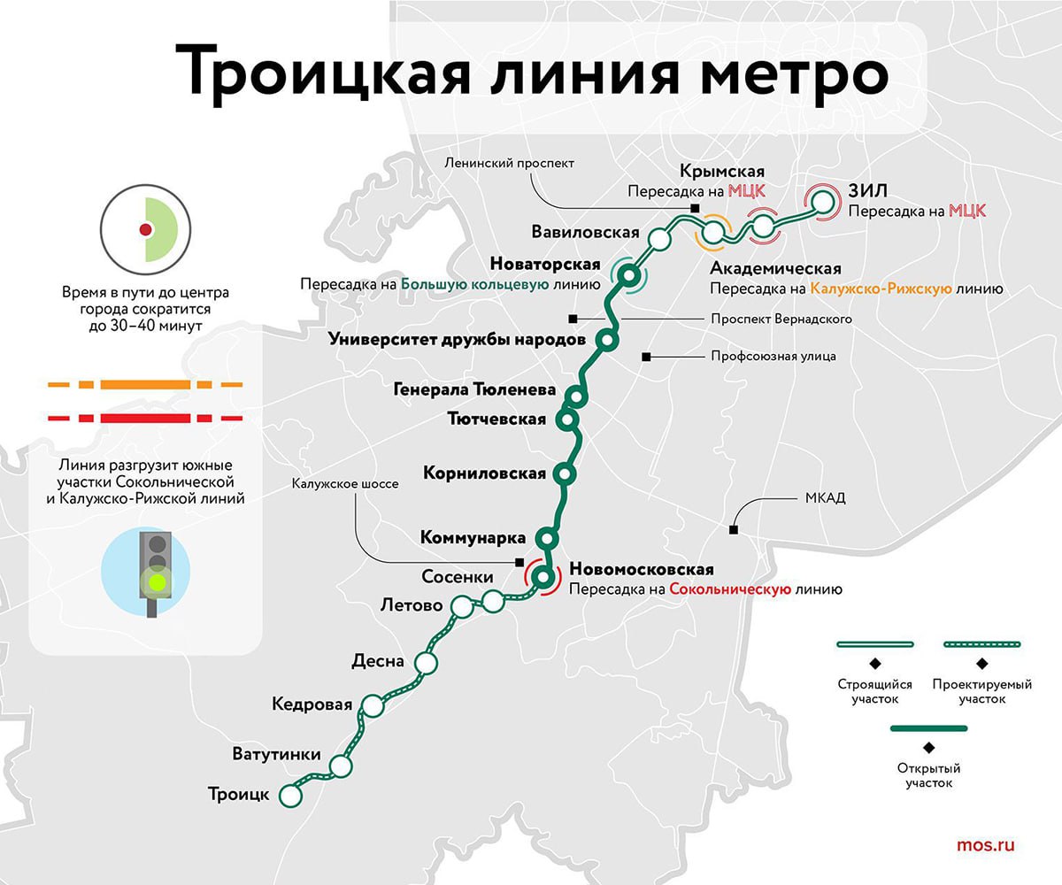 Власти Москвы планируют завершить строительство шести станций Троицкой линии метро. Так, появятся остановки «Сосенки», «Летово», «Десна», «Кедровая», «Ватутинки» и «Троицк». Они позволят сократить время поездки до 30-40 минут.