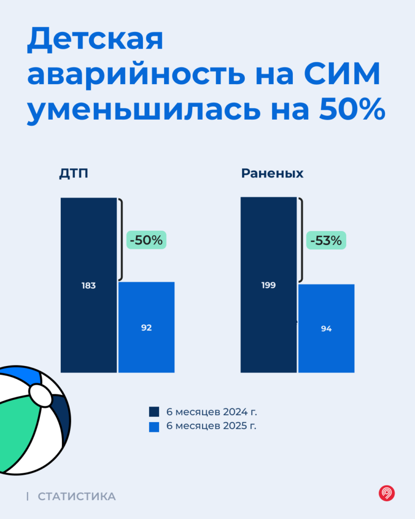 Положительная динамика заметна и в отношении детской аварийности. В 2024 году в ДТП с участием СИМ пострадали 183 ребёнка, в 2025 году — 92. Из них были ранены 199 и 94 человека соответственно (-53% от года к году). При этом большая часть аварий происходила на частных электросамокатах (51%).