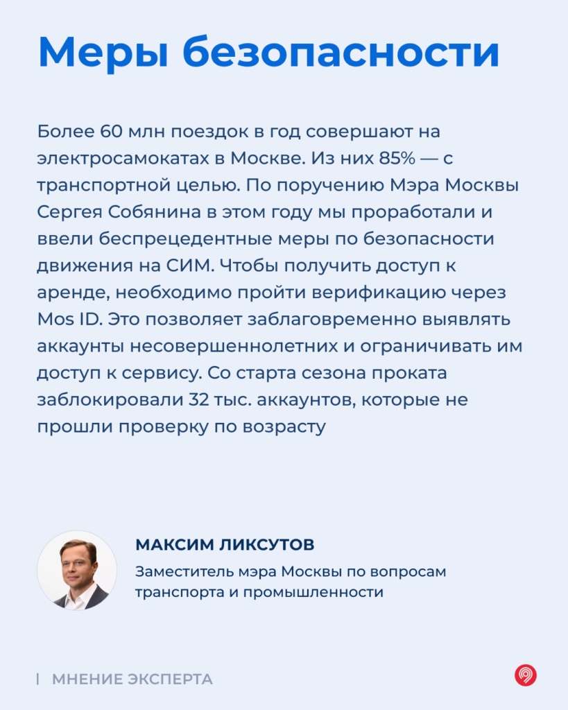 «Более 60 млн поездок в год совершают на электросамокатах в Москве. Из них 85% — с транспортной целью. По поручению Мэра Москвы Сергея Собянина в этом году мы проработали и ввели беспрецедентные меры по безопасности движения на СИМ. Со старта сезона проката заблокировали 32 тысяч аккаунтов, которые не прошли проверку по возрасту».