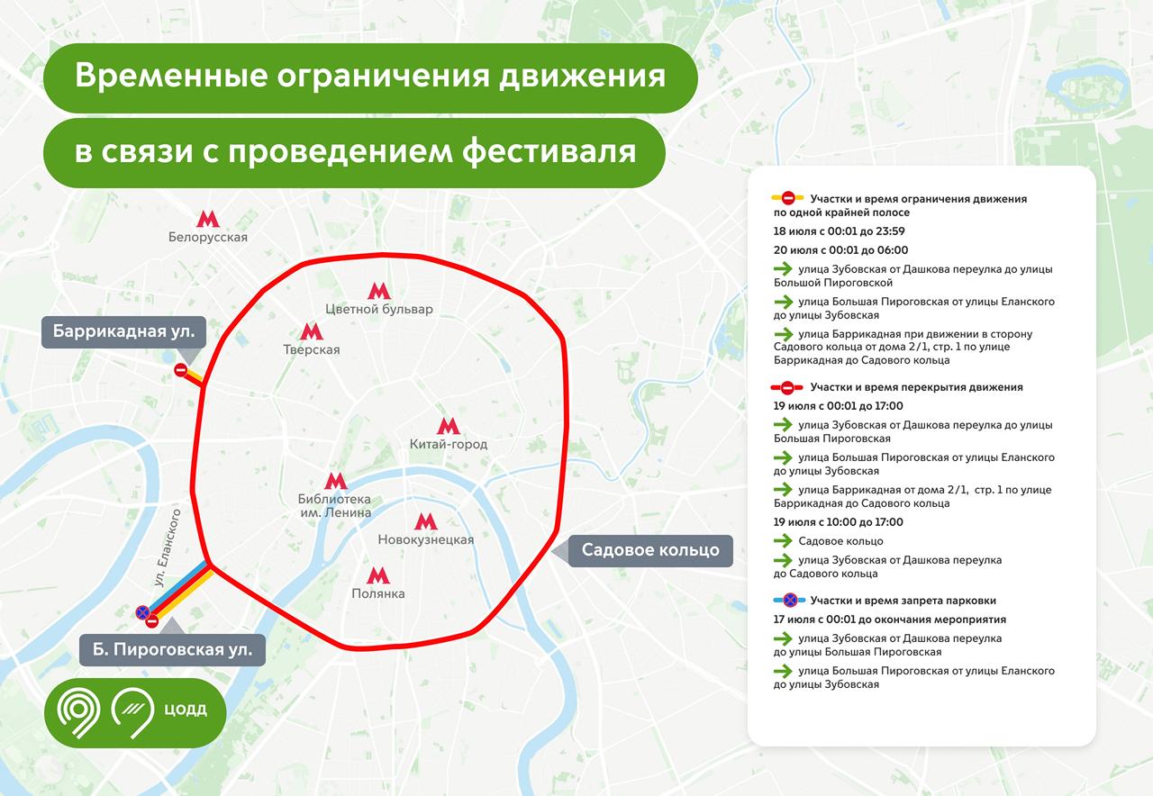 В связи с проведением фестиваля движение будет ограничено на Зубовской, Большой Пироговской и Баррикадной улицах. Проезд по ним перекроют в период с 00:01 до 17:00. Также движение автомобилей с 10:00 до 17:00 будет закрыто на Садовом кольце.