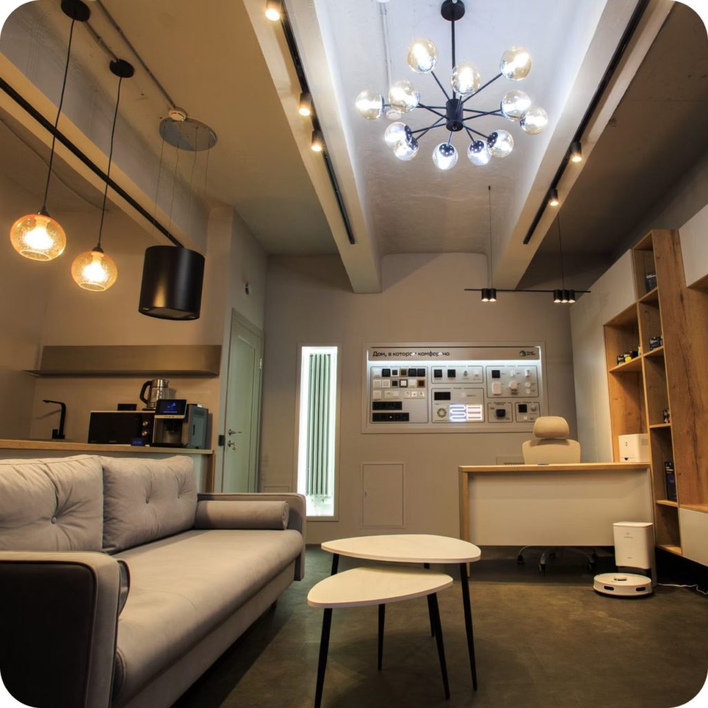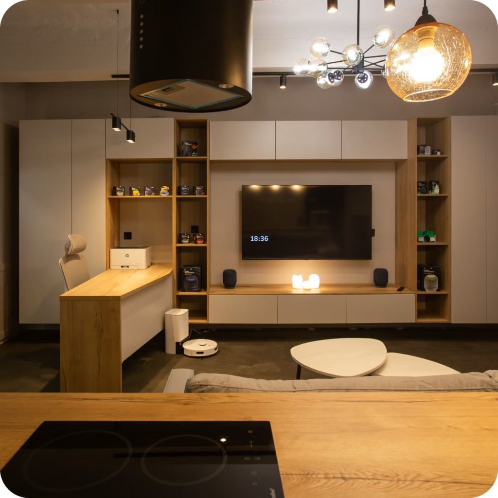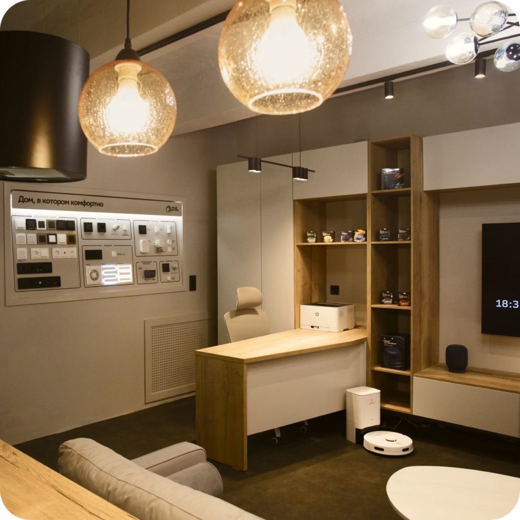 Внутри реализовано более 100 сценариев: поддержание комфортной температуры, автоматическая смена освещения, система умной защиты от протечек, управление бытовыми приборами с помощью умных розеток и другое. Кроме того, в шоуруме стоят умные ТВ и колонки с искусственным интеллектом GigaChat.