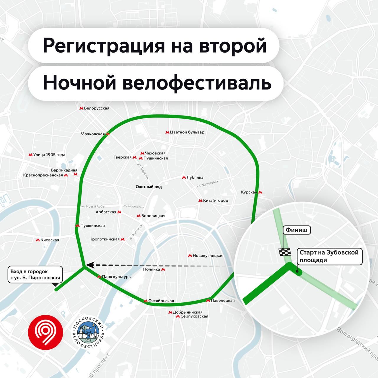 Маршрут пройдёт по Садовому кольцу. Фестивальный городок откроется в 20:00 на Зубовской площади. Старт начнётся в 21:00, 22:00 и 23:00 — в зависимости от времени регистрации. Программа завершится в 01:00. Дептранс Москвы также напомнил о безопасности: следует захватить шлем, велосипедные фонари и защиту для локтей и коленей.