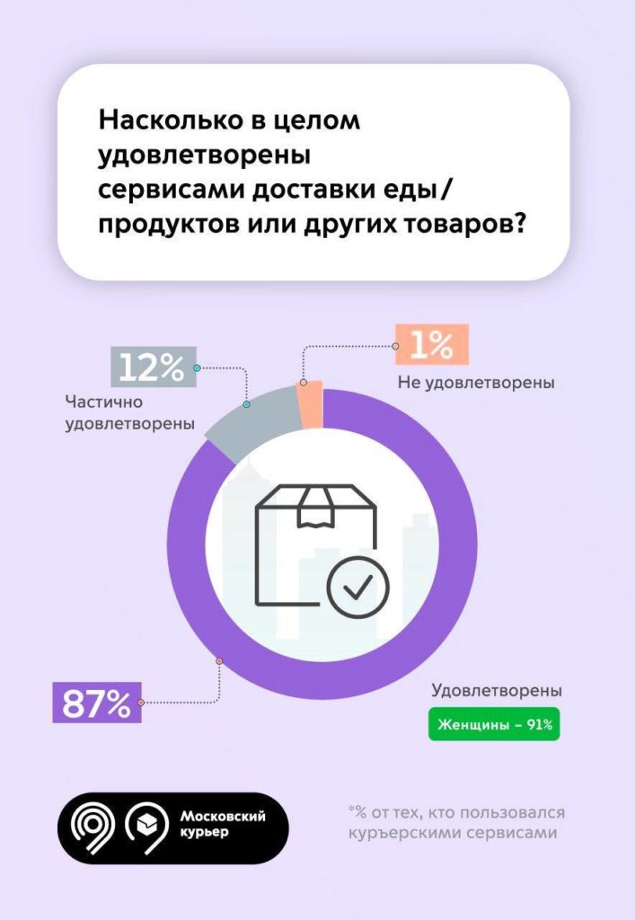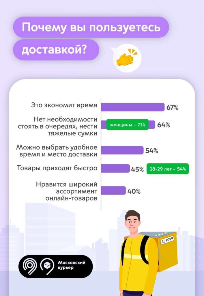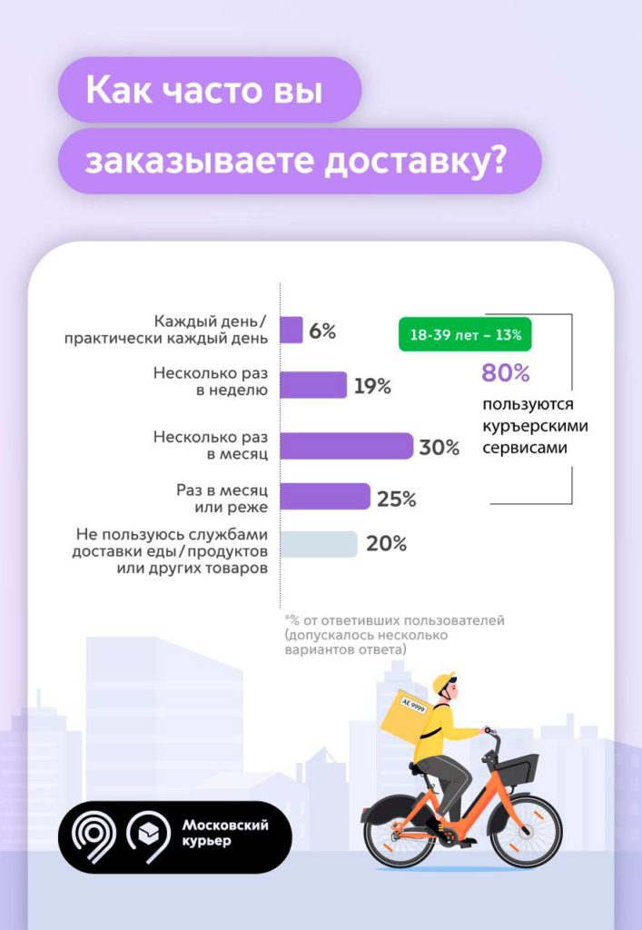 Согласно результатам исследования, москвичи ценят доставку за экономию времени (67%), возможность выбрать удобное время и место получения заказа (54%), а также отсутствие очередей (64%). Опрос показал, что 30% жителей города оформляют доставку несколько раз месяц. Ещё 25% – раз месяц или реже, 19% – несколько раз в неделю, а 6% – каждый день.