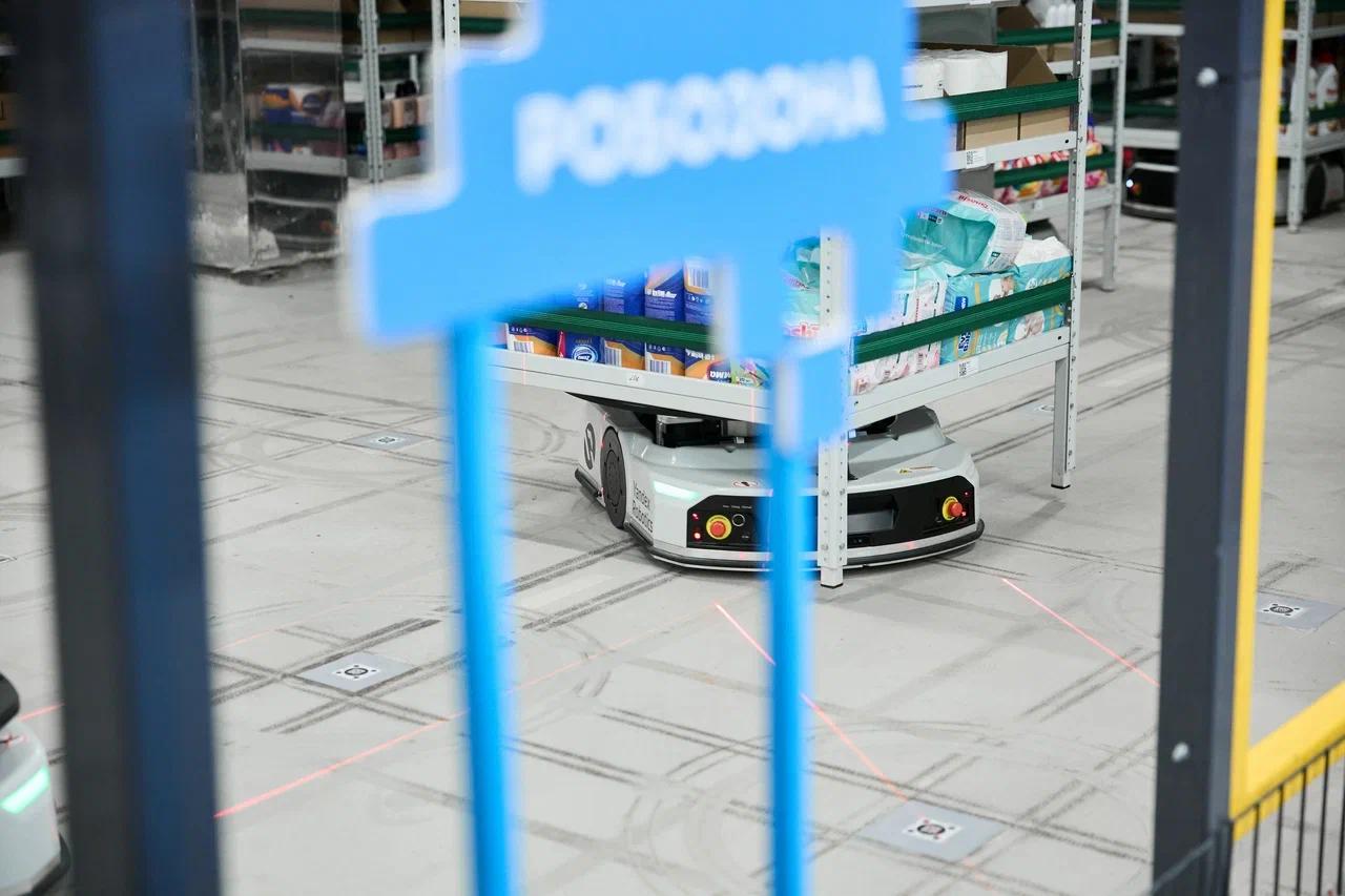 Так называемая «робозона» занимает 28% площади даркстора: в ней работают 12 автономных мобильных роботов и используются 84 стеллажа. Один и тот же товар может находиться на нескольких стеллажах в разных сочетаниях — это позволяет размещать на той же площади на 15% больше товаров.