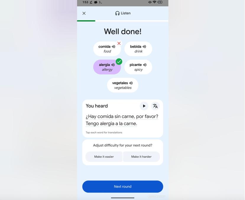 Google Translate работает над функцией для изучения иностранных языков в стиле Duolingo, о ней стало известно ещё в апреле 2025 года. Её задача — помочь пользователям изучать иностранные языки. Ранее нажатие на значок не работало, а среди языковых пар был только английский и испанский.