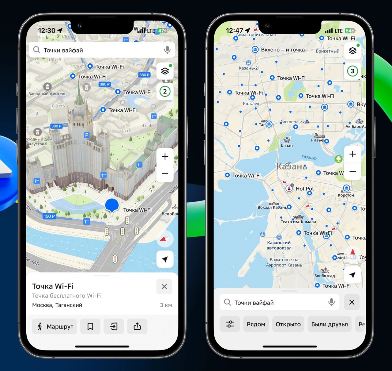 Точки доступа Wi-Fi можно найти на остановках общественного транспорта, в парках, библиотеках, учреждениях культуры, а также в ТЦ и заведениях общепита. Всего на картах размещено более 12,4 тысяч точек в 17 российских городах, среди которых — Москва, Нижний Новгород, Самара, Казань, Волгоград, Тюмень и другие.