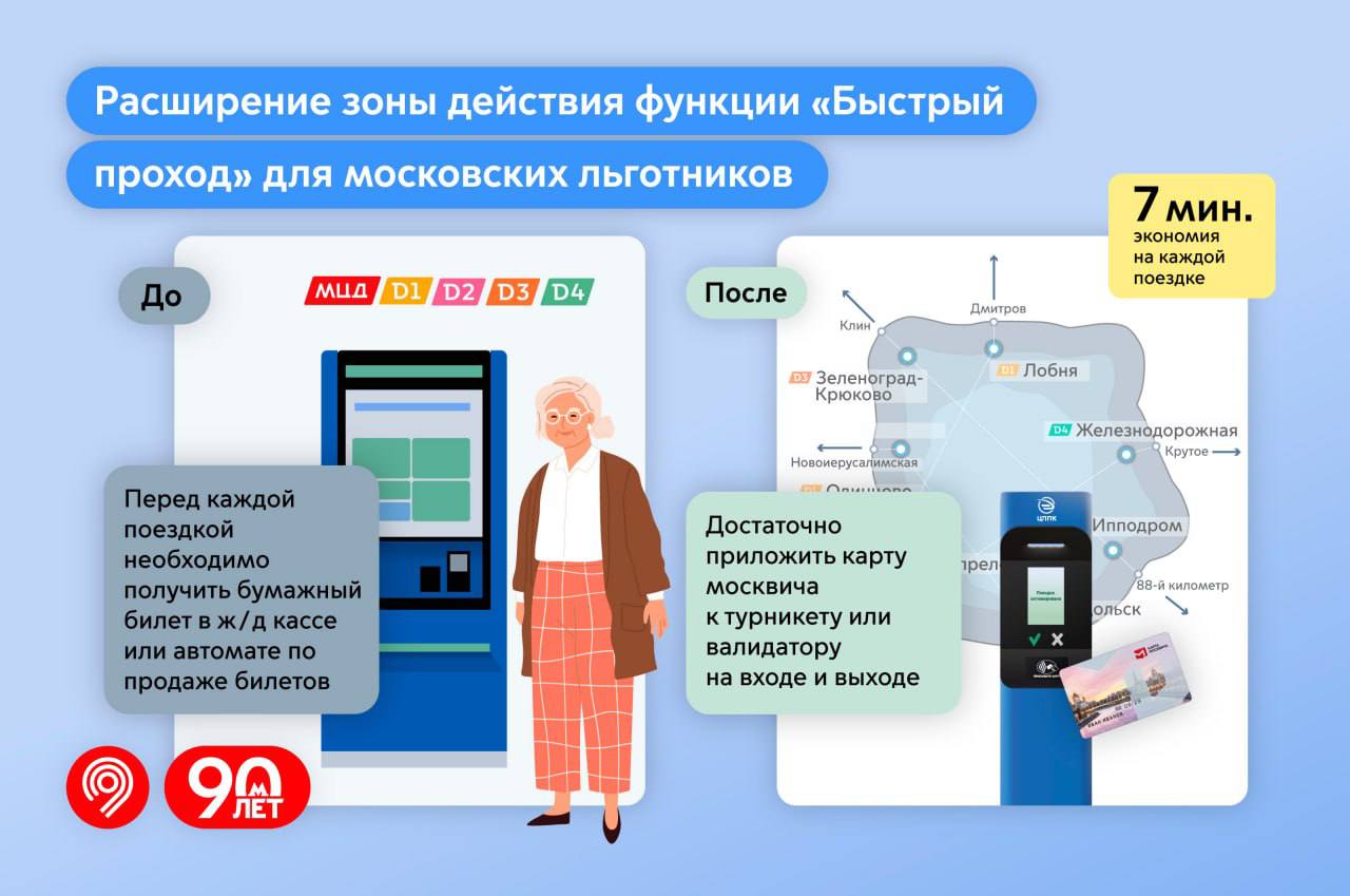 «Быстрый проход» для владельцев карт москвича заработает в Московской области за пределами МЦД с первого сентября: московским льготникам больше не нужны будут бумажные билеты на пригородные электропоезда ЦППК и МТППК за пределами МЦД. Расширение зоны действия функции «Быстрый проход» позволит трём млн владельцам карт москвича с бесплатным проездом экономить до семи минут на каждой поездке.