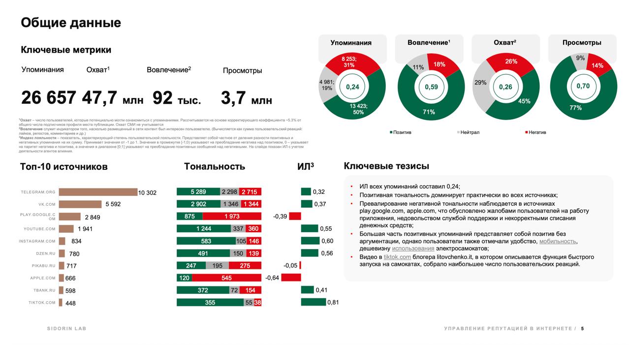 Проблемы с завершением поездки, ошибки геолокации и задержки при активации самокатов;Опасность и травматизм — 16%. Пользователи упоминают травмы, которые получили сами, или описывают происшествия, свидетелями которых были;Проблемы с парковкой — 12%. Жалобы связаны с беспорядочной парковкой, нехваткой официальных зон и сложностями с навигацией по допустимым местам, которые возникают из-за сбоев GPS или нестабильного мобильного интернета. Многие пользователи испытывают фрустрацию, когда не могут завершить поездку из-за «невидимой» или удалённой парковки;Негативное сравнение с другими видами транспорта — 11%.Самокатам противопоставляют личные авто, метро, такси и даже пешие прогулки. Критикуют малую приспособленность к плохой погоде и нестабильность поездки;Стоимость аренды — 10%. Среди комментариев встречаются жалобы на повышенные тарифы, платную паузу и непредсказуемую итоговую сумму поездки;Недостаточно высокий уровень клиентского сервиса — семь процентов. Пользователи отмечают долгое или отсутствующее реагирование службы поддержки, невозможность быстро вернуть деньги или оспорить списания, формальные шаблонные ответы;Некорректные списания средств — 6%. Пользователи жалуются на неправильные списания при аренде самокатов, а также на проблему с возвратом этих денежных средств.Так, можно сделать вывод: несмотря на озвученные трудности, общее восприятие кикшеринга — ярко позитивное, особенно среди молодых и активных жителей мегаполисов.