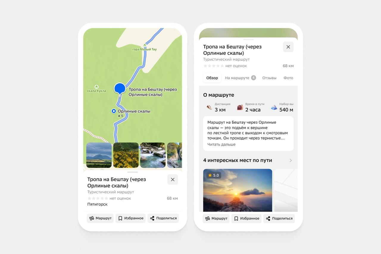 В карточках маршрутов можно найти описание, длину, время в пути, рельеф и интересные точки маршрутов: природные достопримечательности или местные кафе — если данные находятся в доступе. Кроме того, в список этих маршрутов вошли и все национальные туристические маршруты России — масштабные маршруты, проходящие через природные парки, исторические центры и культурные ландшафты.