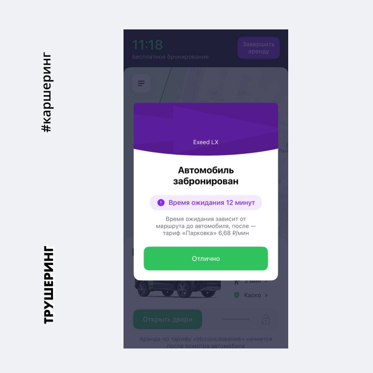Время на дорогу до машины назначается автоматически и зависит от удалённости транспортного средства. Если не добраться до автомобиля вовремя, начнётся поминутная оплата в режиме «Парковка». Его стоимость рассчитывается в зависимости от тарифа и класса авто. Для водителей уровней 4 и 5 условия останутся прежними.