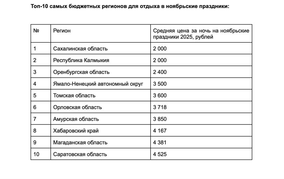 В ценовом диапазоне от двух до пяти тысяч рублей за ночь в этом году на ноябрьские праздники можно отдохнуть, например, в Сахалинской области (средняя цена за ночь две тысячи рублей), Республике Калмыкия (две тысячи рублей), Орловской области (3 718 рублей), Хабаровском крае (4 167 рублей), Республике Хакасия (4 600 рублей).