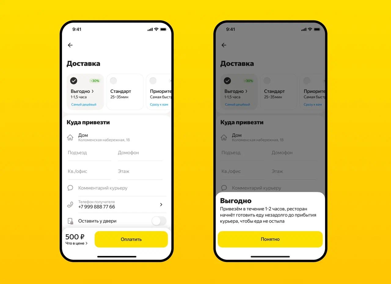При выборе тарифа заказ везут немного дольше (1–1,5 часа), а стоимость доставки становится ниже на 30%. Тариф действует только в зонах доставки пешими и велокурьерам: на такие районы приходится большинство заказов на сервисе.