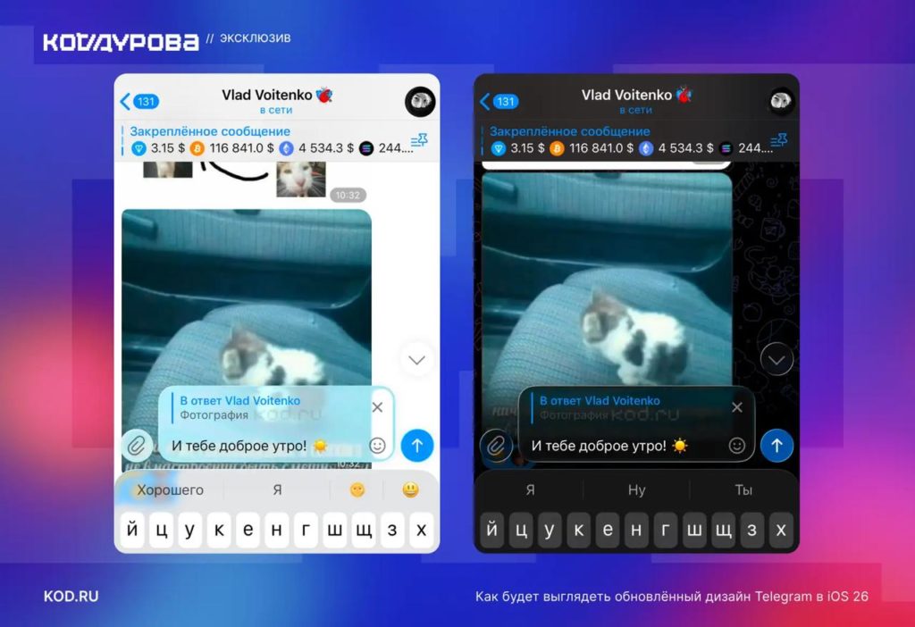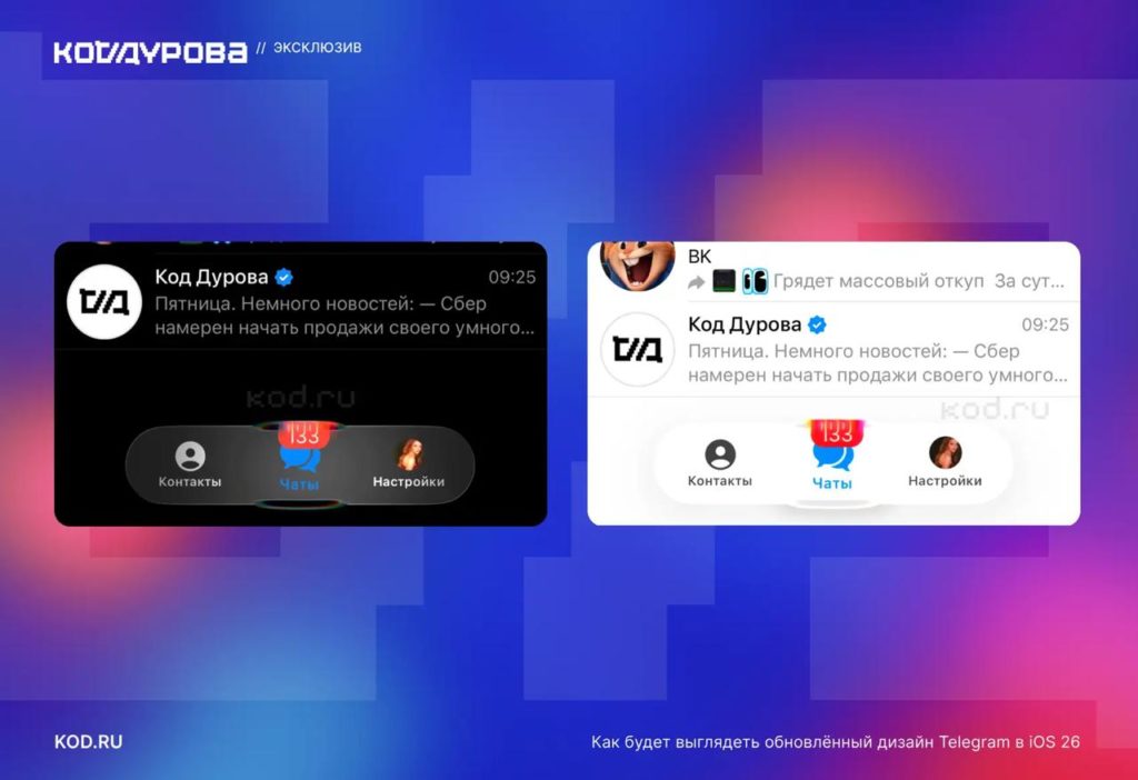 С выходом iOS 26 мессенджер решил адаптировать визуал под новый язык дизайна Liquid Glass — пользователи смогут перейти на «стекло» и прозрачные элементы. Инсайдерскими скриншотами поделился Код Дурова: