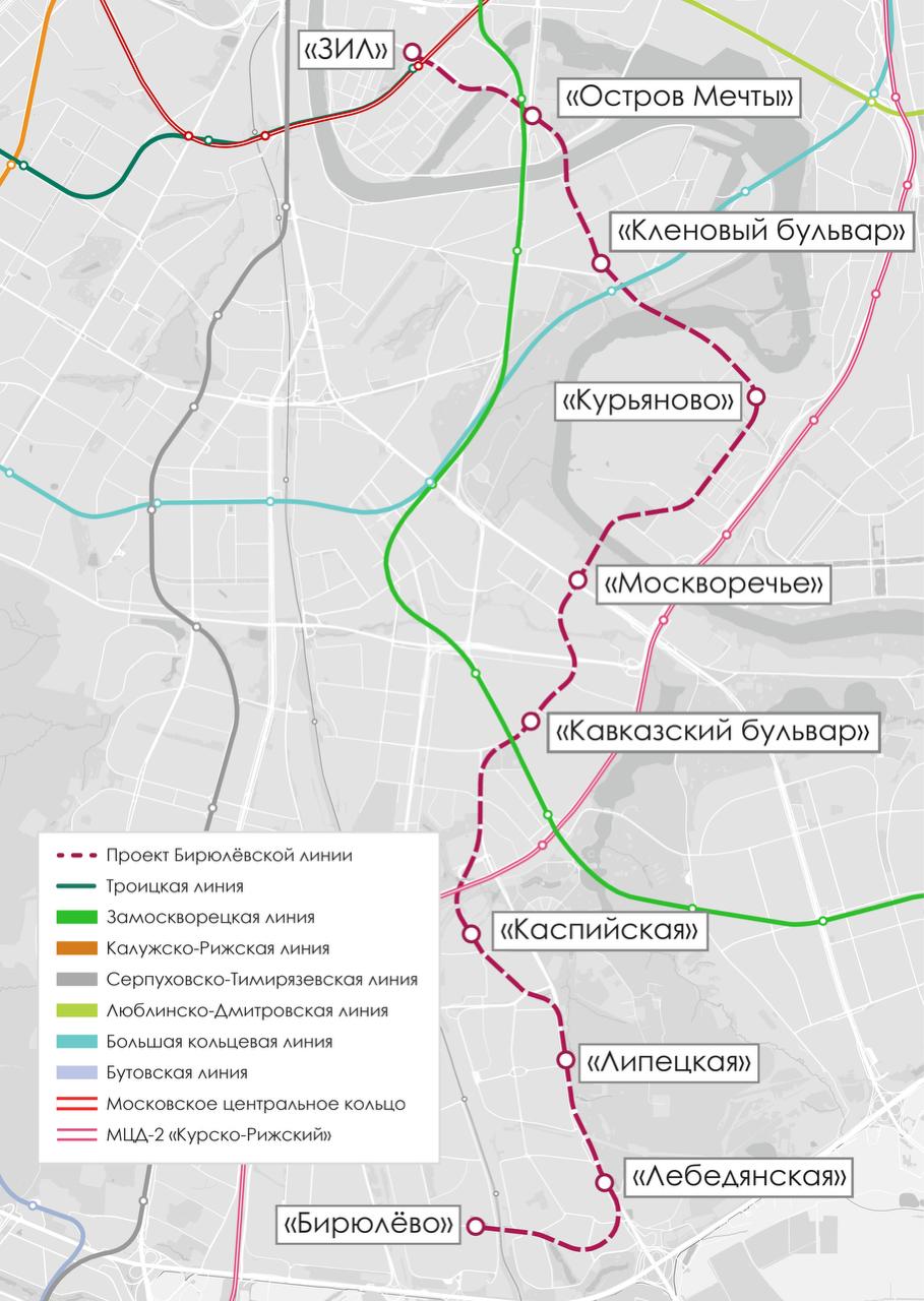 Протяжённость Бирюлёвской линии метро составит 22,2 километра. Всего будет открыто 10 станций с пересадками на Замоскворецкую и Троицкую линии, БКЛ, МЦК и Павелецкое направление МЖД.