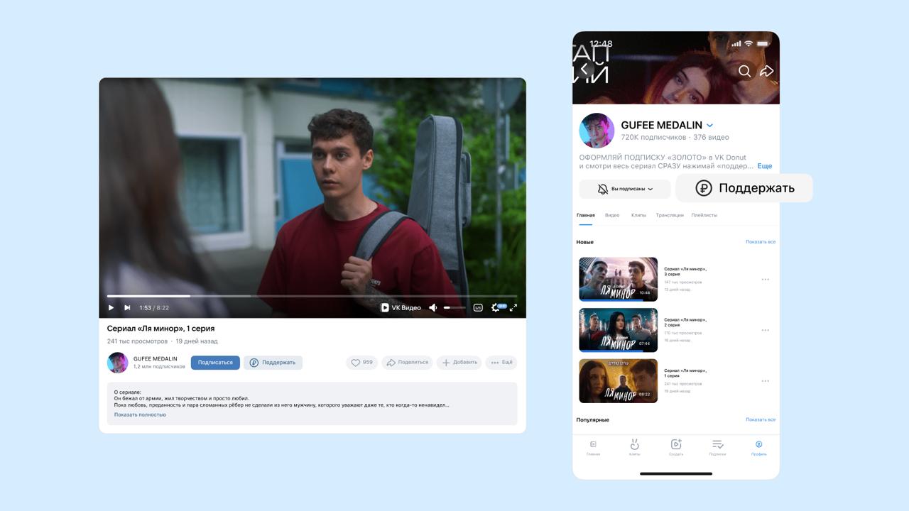 В VK Видео добавили поддержку VK Donut — авторы смогут подключить донаты к своим видеороликам. Под видео и в профиле появится кнопка «Поддержать».