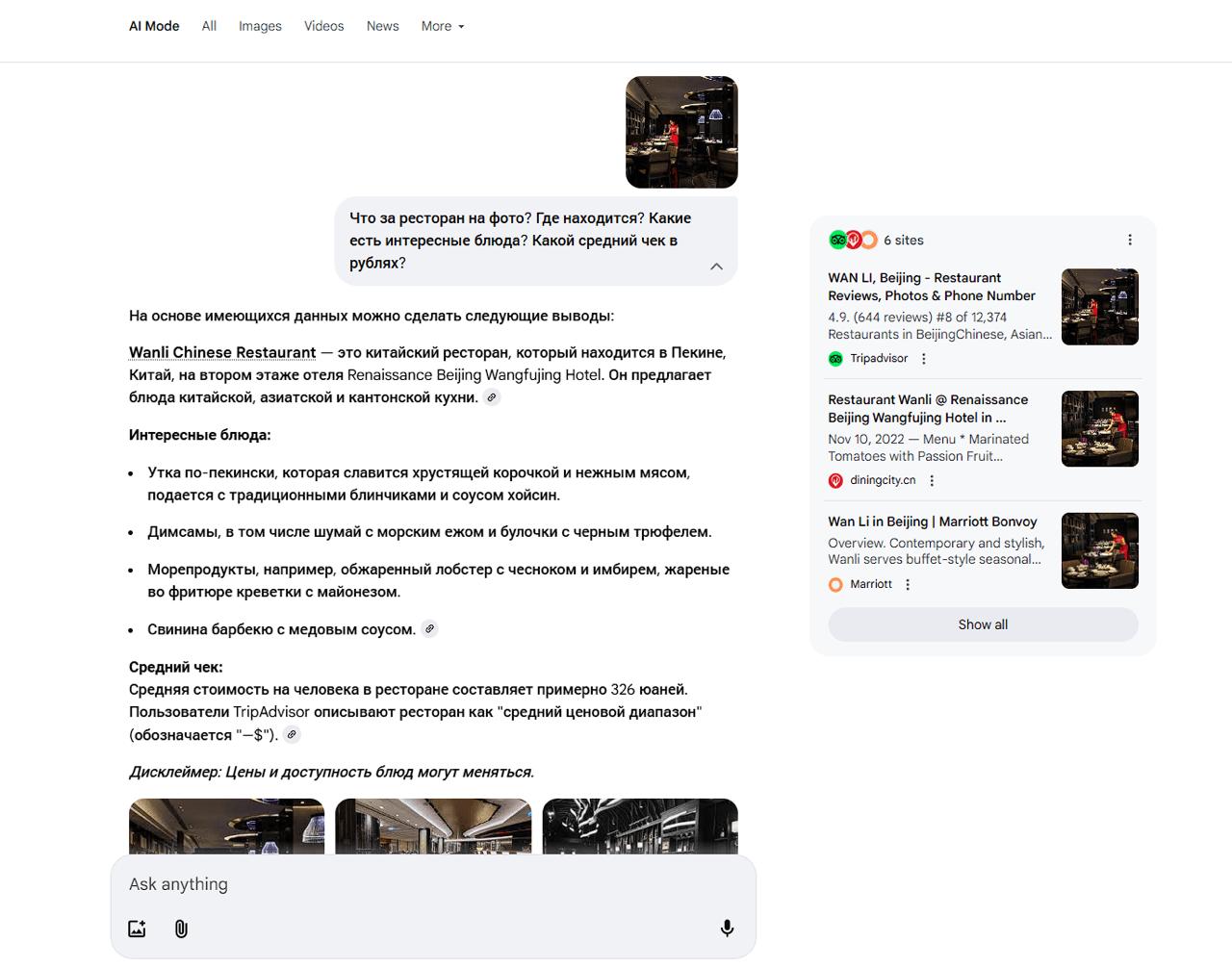 Режим открывает чат с нейросетью Gemini 2.5 Pro, где можно задавать вопросы в два раза длиннее, чем в обычном поиске. Модель даст развёрнутый ответ со ссылками на источники, изображениями и видео. Потом можно будет продолжить диалог с Gemini.