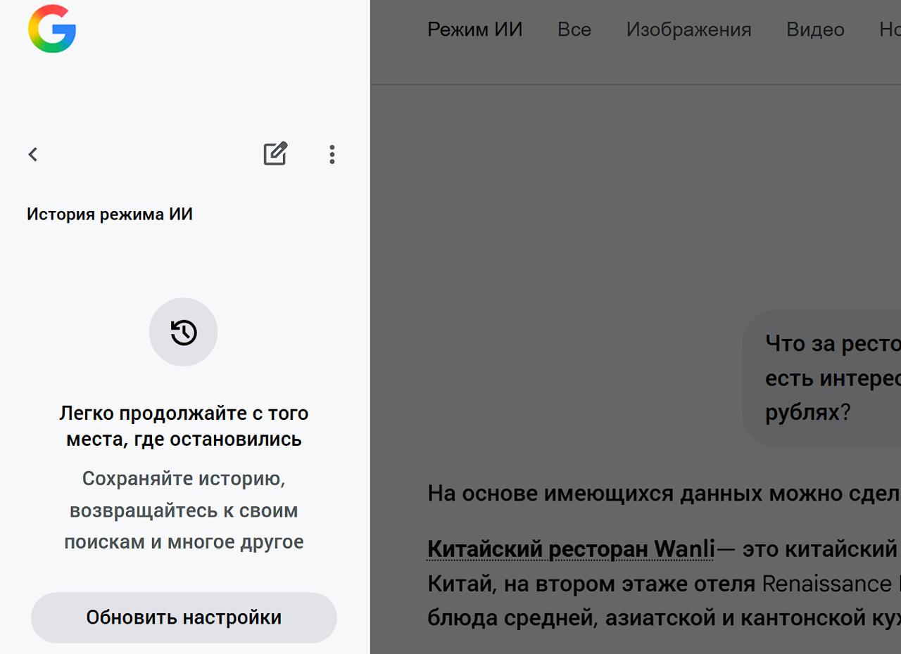 История чатов в ИИ-режиме можно включить в настройках. Компания представила AI Mode в марте 2025 года.