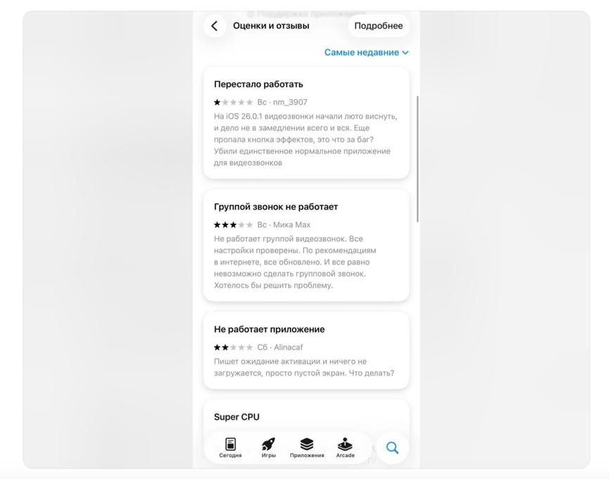 Также жалобы от русскоязычных пользователей на перебои в работе FaceTime появились на странице приложения в App Store. Некоторые отмечают, что проблемы появились после обновления iOS.