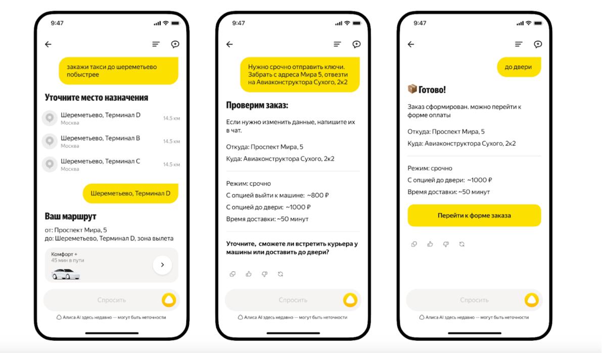 Теперь пользователям не нужно будет самим разбираться в опциях и тарифах сервисов, например, Доставки. Можно просто сказать нейросети, что нужно срочно отправить ключи по определённому адресу — Алиса AI призовёт ИИ-агента сервиса, который уточнит все детали, предложит пользователю подходящий вариант и предзаполнит форму заказа. Перед тем как его оформить, пользователю нужно будет подтвердить все данные: адрес, условия, стоимость.